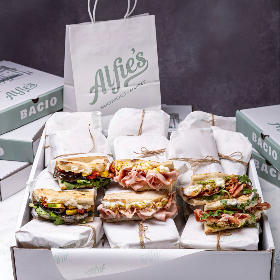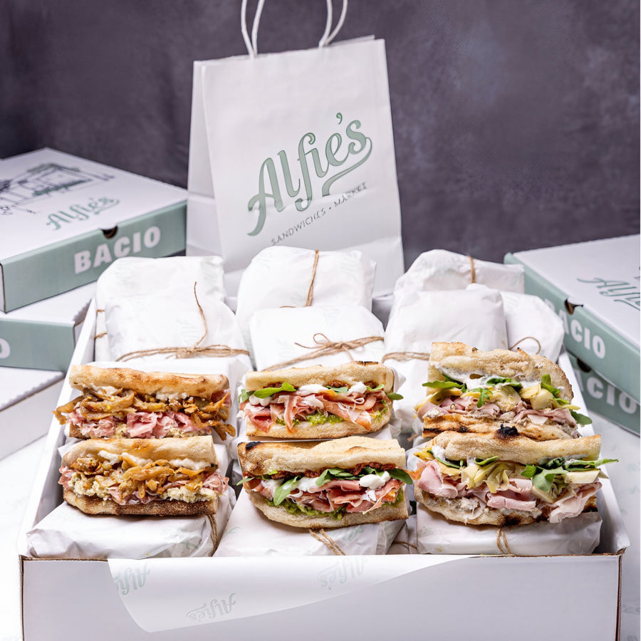 Choose from our pre-built Bacio Boxes — a curated combination of our Signature and Classic sandwiches, ideal for 10–12 guests.