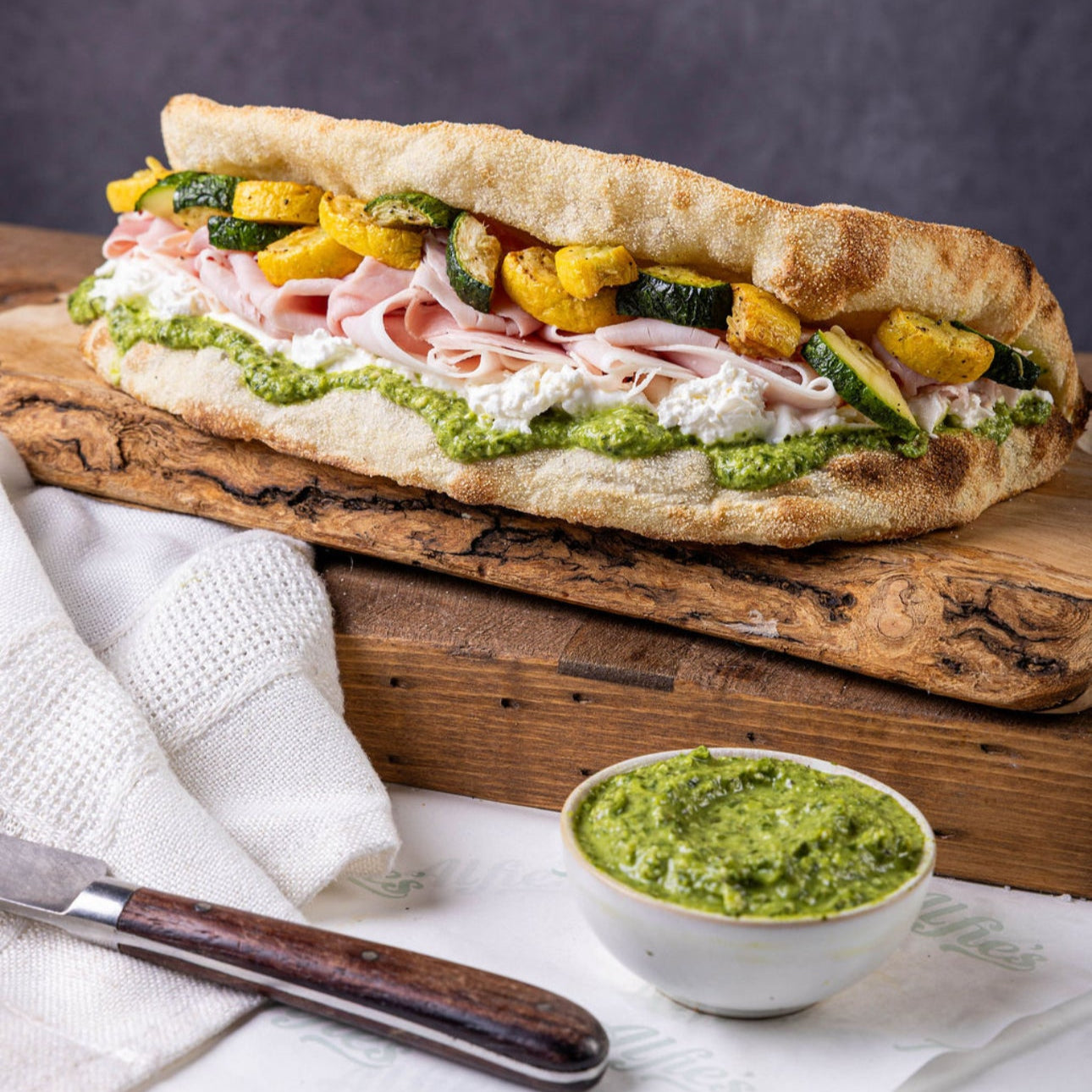 Alfie’s Donatella is a lush, Italian-leaning sandwich built on Leoncini Prosciutto Cotto, lemon basil pesto, roasted zucchini, and imported whole burrata from Italy. The prosciutto cotto brings a gentle, savory richness, while the burrata adds that creamy, indulgent center that makes each bite feel extra plush. Lemon basil pesto lifts the whole sandwich with freshness and herbaceous brightness, keeping the flavors from feeling too heavy. Roasted zucchini rounds it out with a soft, smoky-sweet vegetal note, giving Donatella a balanced, composed finish.